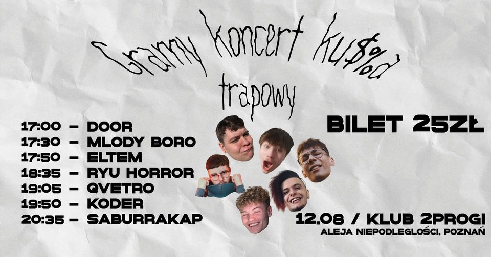 Sześciu podziemnych raperów (Saburrakap, Koder, QvetRo, Ryu Horror, Eltem, Młody Boro) zagra koncert w Poznaniu w klubie 2progi.